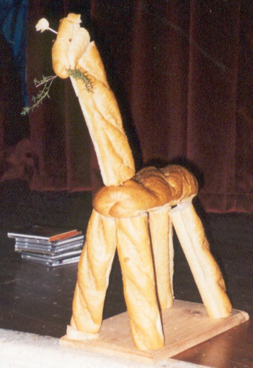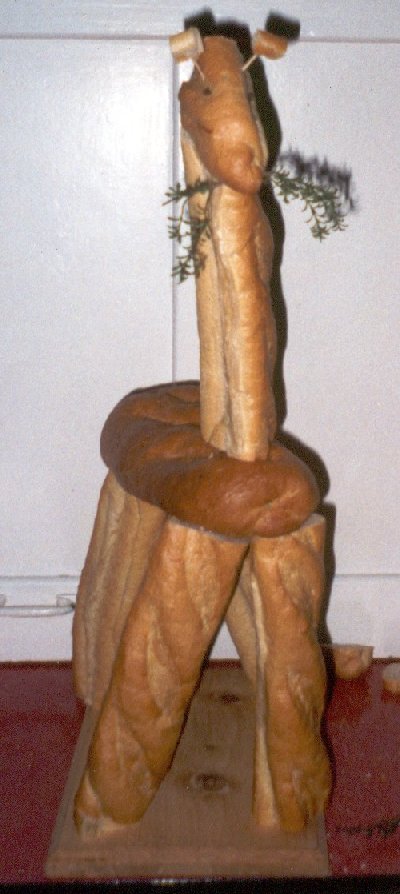 Since our Shire is one of the two in Africa, we like to play with images of African creatures. I've always wanted to try fiddling with French loaves to make a bread-giraffe; they seem so eminently suited to it, and it's one up on bread swans! Again, the hazy idea was mine, but Lady Cassandra really made it a reality. The camel-leopard's body is an oval French loaf, and his legs and neck are half-size versions of the long, thin French loaves, cut down to provide more stability. His head is the end of a thin loaf, and he's chewing on a sprig of winter savoury. The loaves are held together with toothpicks, kebab sticks and sheer psychokinesis on the part of the designers (he kept on wanting to sway drunkenly on his legs before falling over). His little horns are bits of bread on toothpicks, and (although you can't see it in these photos) he has a cute little stringy bread tail. We served him with the soup, but provided extra bread as well, which was fortunate, since no-one had the heart to eat him. He only fell over once during feast... |